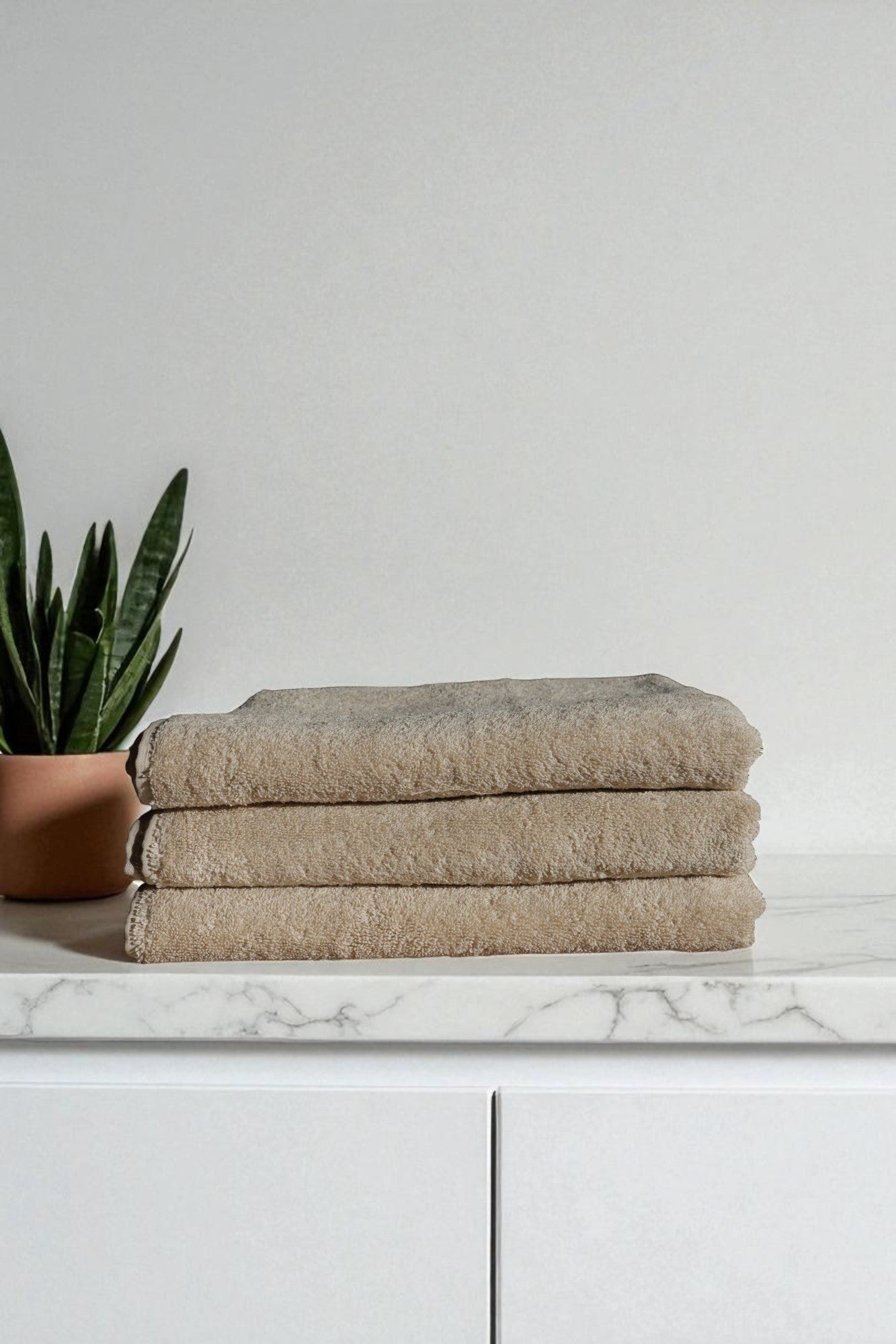 Alle Handtücher sind aus 100 % Baumwolle (600 GSM) gefertigt, in einem zeitlosen Beige gehalten und verfügen über einen praktischen Kordelaufhänger.
