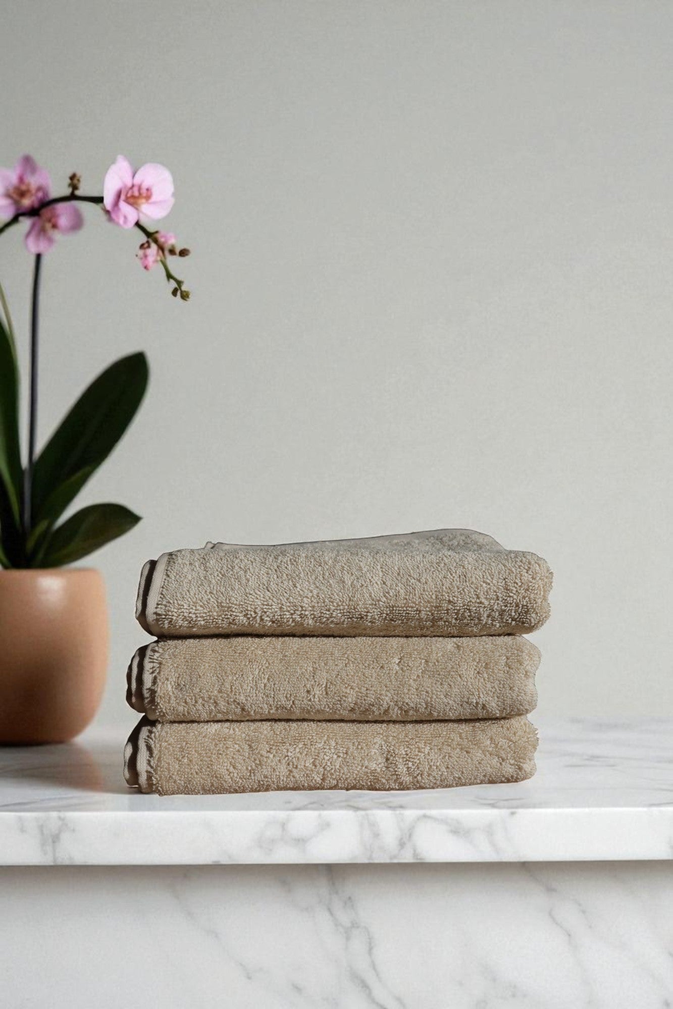 Alle Handtücher sind aus 100 % Baumwolle (600 GSM) gefertigt, in einem zeitlosen Beige gehalten und verfügen über einen praktischen Kordelaufhänger.